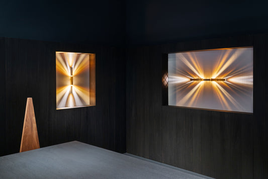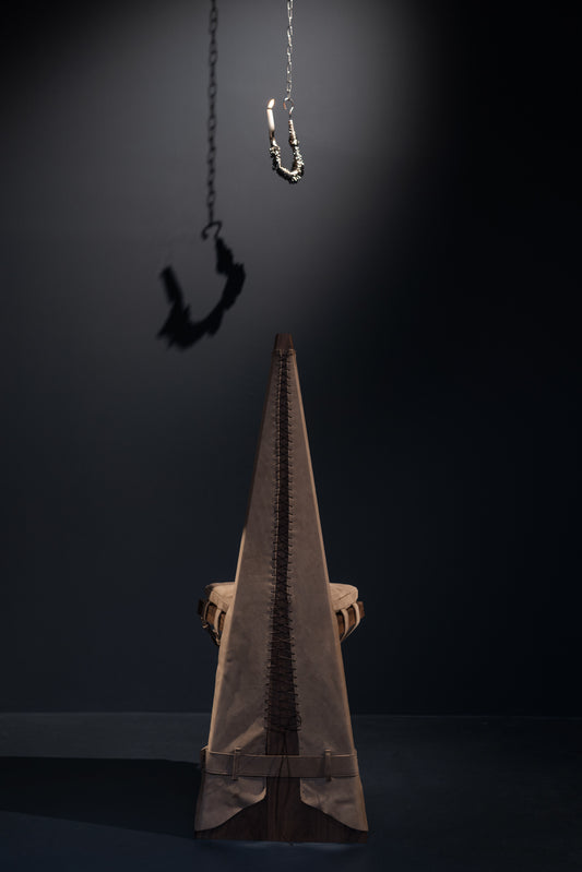 On show are extraordinary objects that place the human being in direct, sharp, and reflective confrontation with the planet and its raw matter, but there are also more intimate statements: chairs dressed in leather and trapped in suffocating corsets; furniture made of iron mesh that recalls twelfth-century armor; vases sheathed in rigid metallic busts, others that look like missiles but hold flowers; luminous objects that, when off, resemble daggers not yet drawn, and when lit, reveal the magic of an infinite horizon. Vases and mirrors with lunar surfaces that feature uncanny combinations with synthetic coloured plastics; lamps evoking the alignment of planets—a fatal eclipse, luminous knots that evoke ancestral languages. The scene is both fascinating and disturbing. These objects estrange and seduce. At times they recall a medieval aesthetic, in other moments something primitive, or posthuman, cybernetic. And yet, there is nothing here that belongs to the obscurantism of the so-called “Dark Ages.” These are objects that process, exorcise, and work through inner experience.