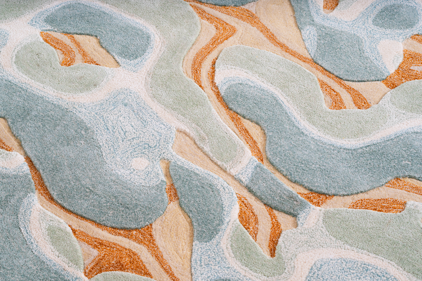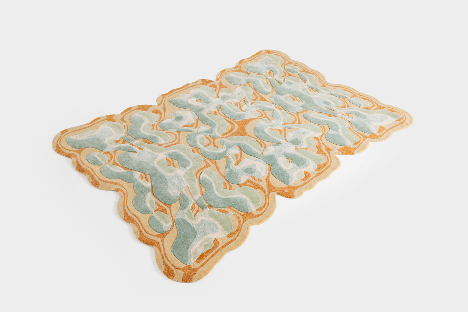 This hand-tufted carpet plays with the technique and the optical illusion of a puffy decoration emerging from the background. Fluid forms and a mix of cool and warm colors add depth and movement, while the gradients enhance the three-dimensional effect