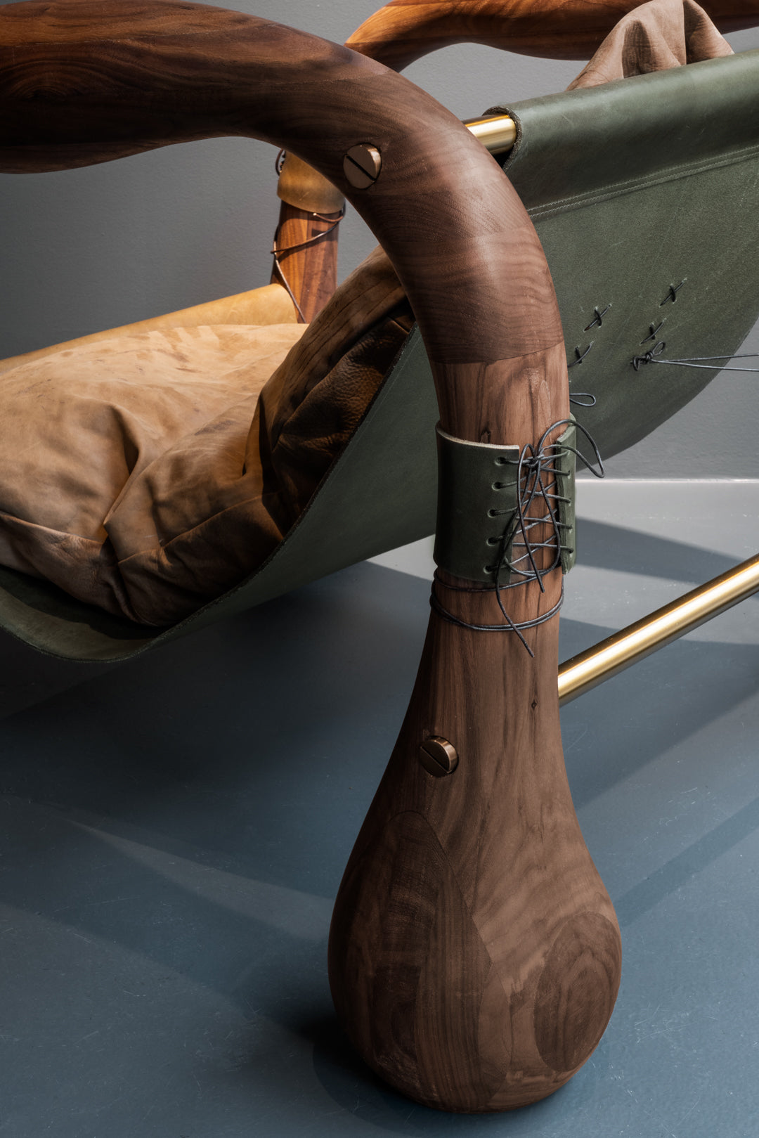 Hammock armchair is a chunky, heavy wooden chair that introduces comfort to hard materials. A cushioned hammock suspended between two tree-like wooden structures. Dressed with metal hardware. This chair creates leisure and relaxation within a “dark” aesthetic, inspired by a summer spent by the beach and resting in a hammock between fruit trees.
