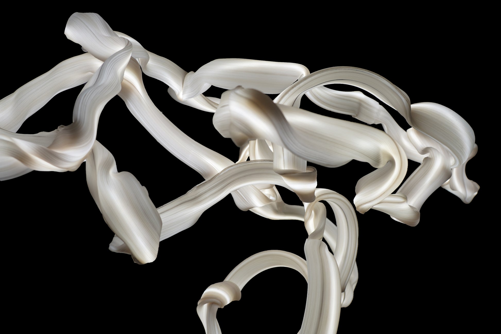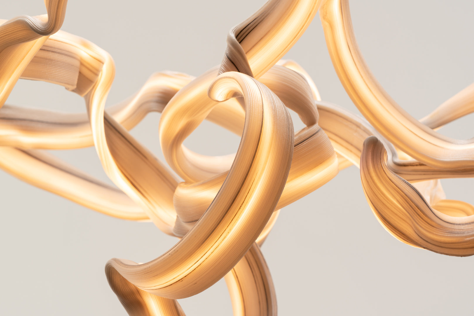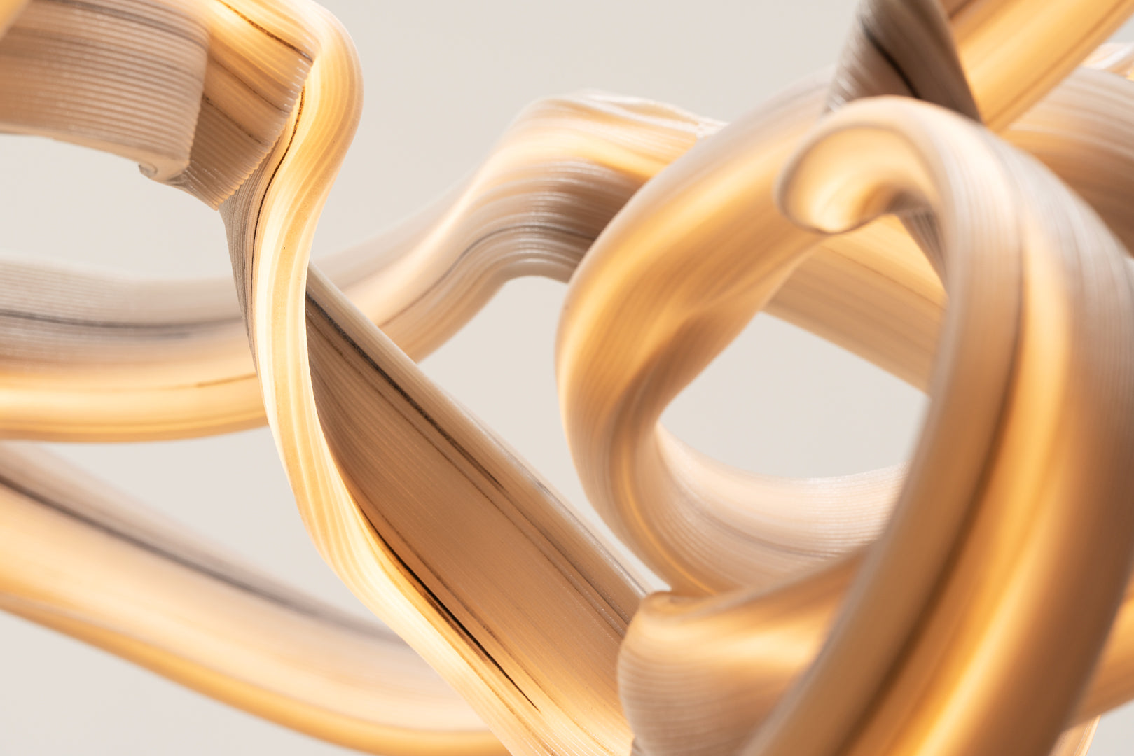 The work reinterprets the expressive potential of flexible materials, pushing beyond the boundaries of traditional textile art. Drawing on her experience with polymer-based substances, Zihan Zhao brings these materials to a state of softness that allows them to be woven. Through intuitive bodily movement and a subconscious sensitivity to the material, the designer twists and shapes the matter within a limited timeframe—just before it solidifies—thus capturing both process and form as the sculptural imprint of a fleeting expression.